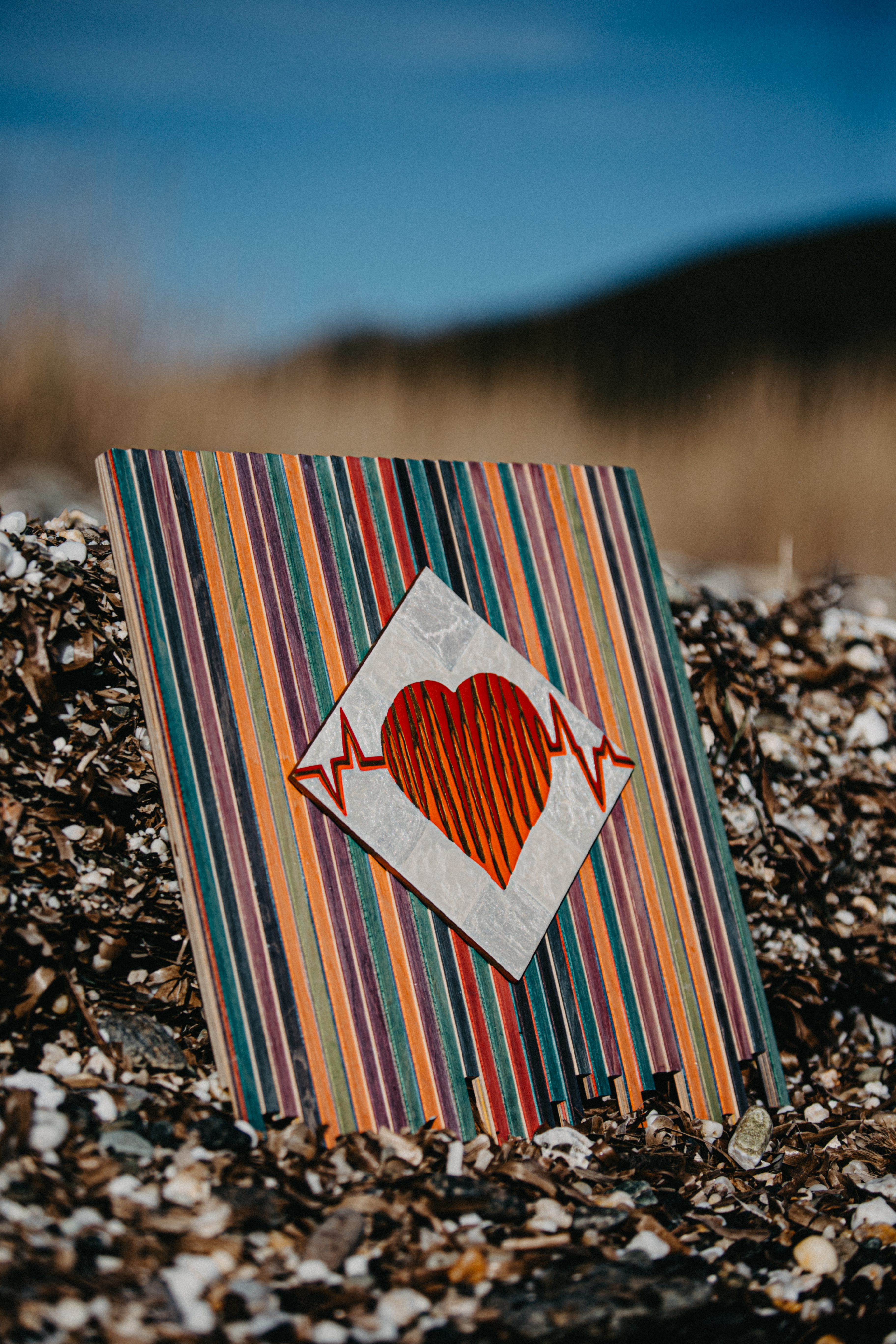 Les œuvres de Mme Cardinali célèbrent le monde naturel d'un point de vue poétique, en mettant l'accent sur la luminosité et la positivité. Son œuvre Infinity Love illustre la vitalité du cœur humain, symbolisant l'amour inconditionnel et la connexion. Le battement de cœur rouge vif gravé dans le carreau de céramique est encadré par la texture chaude du bois de skateboard retravaillé, ancrant l'œuvre dans une esthétique à la fois contemporaine et intemporelle. Chaque œuvre possède une aura de rareté, authentifiée par une discrète plaque de laiton gravée incrustée au verso, clin d'œil discret à l'attention qu'elle porte aux détails et à l'artisanat.